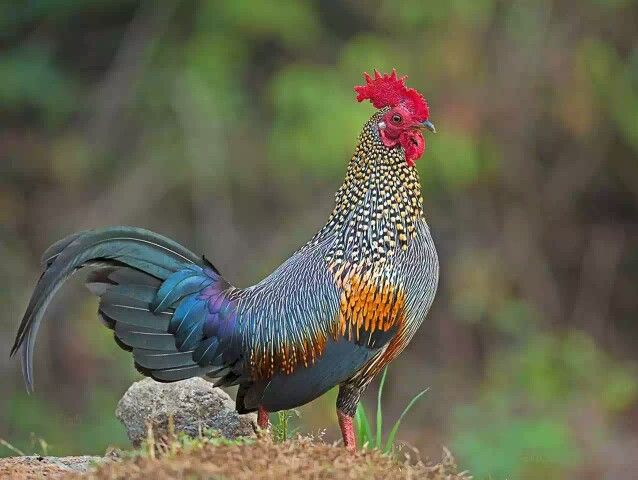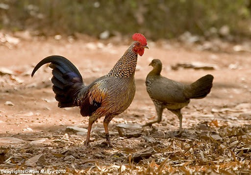 De zwarte halsveren hebben gele uiteinden. De middelste vleugelpennen zijn oranjerood. Hij heeft een zwarte staart met een groene glans. De vogels komen voor in India en zijn dichte familie van onze eigen kip.